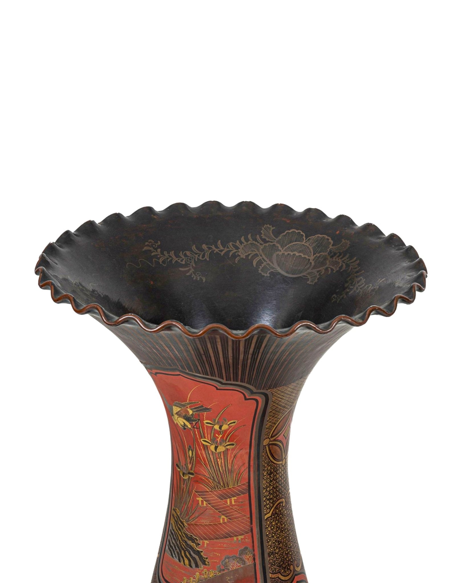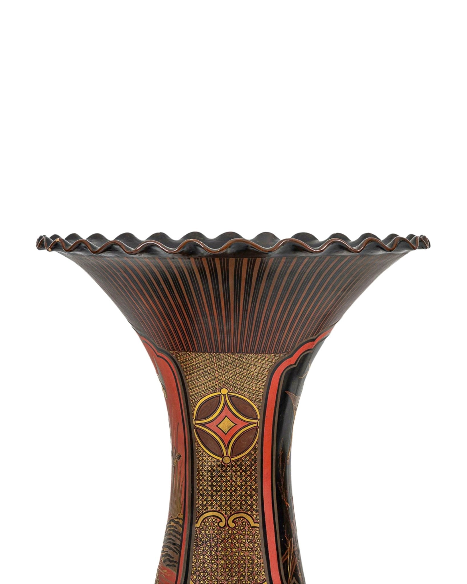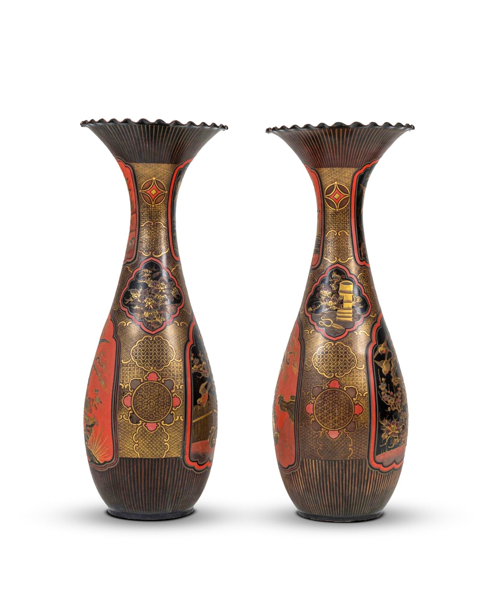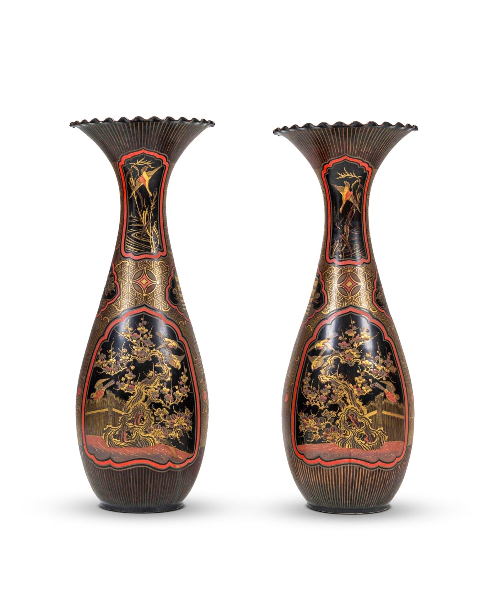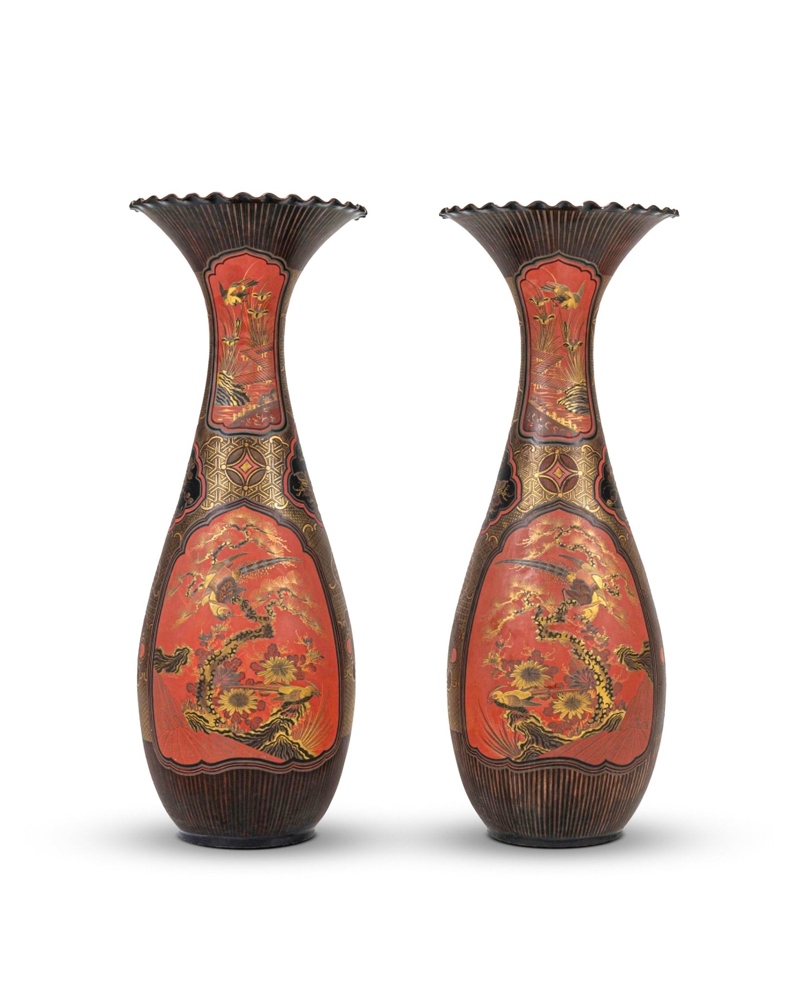 An exquisite pair of Meiji-era lacquered porcelain vases, featuring a bold baluster-shape with gentle scalloped mouth.