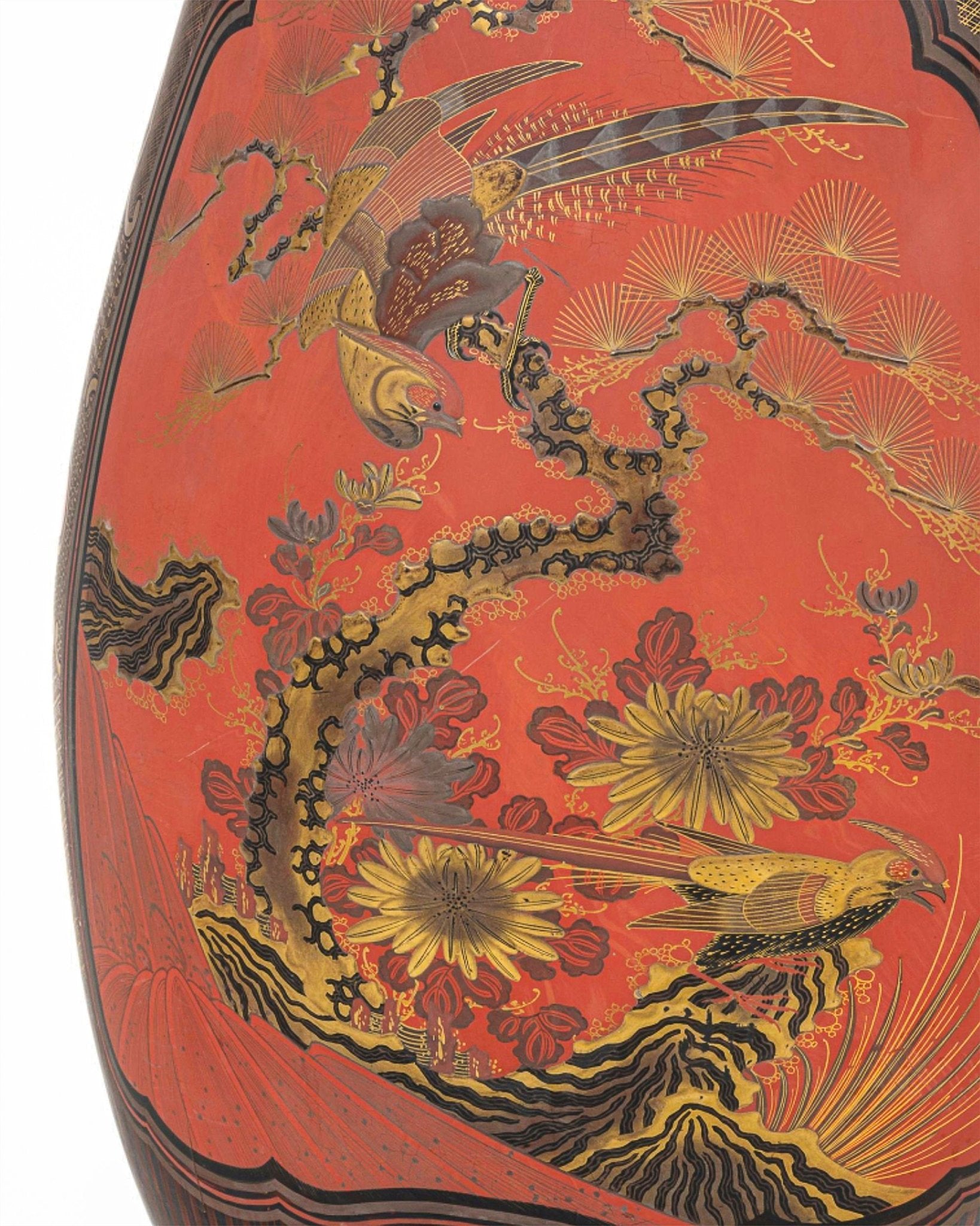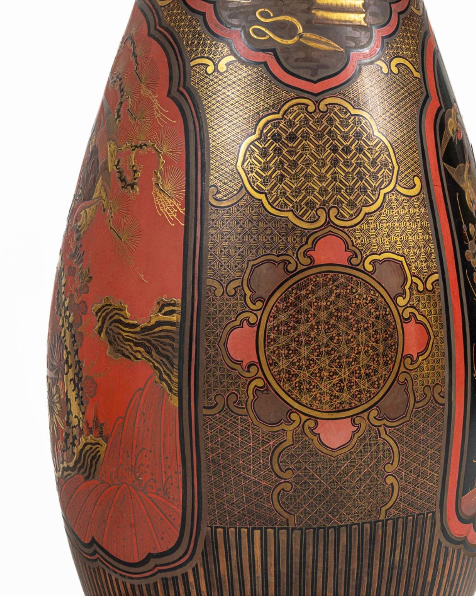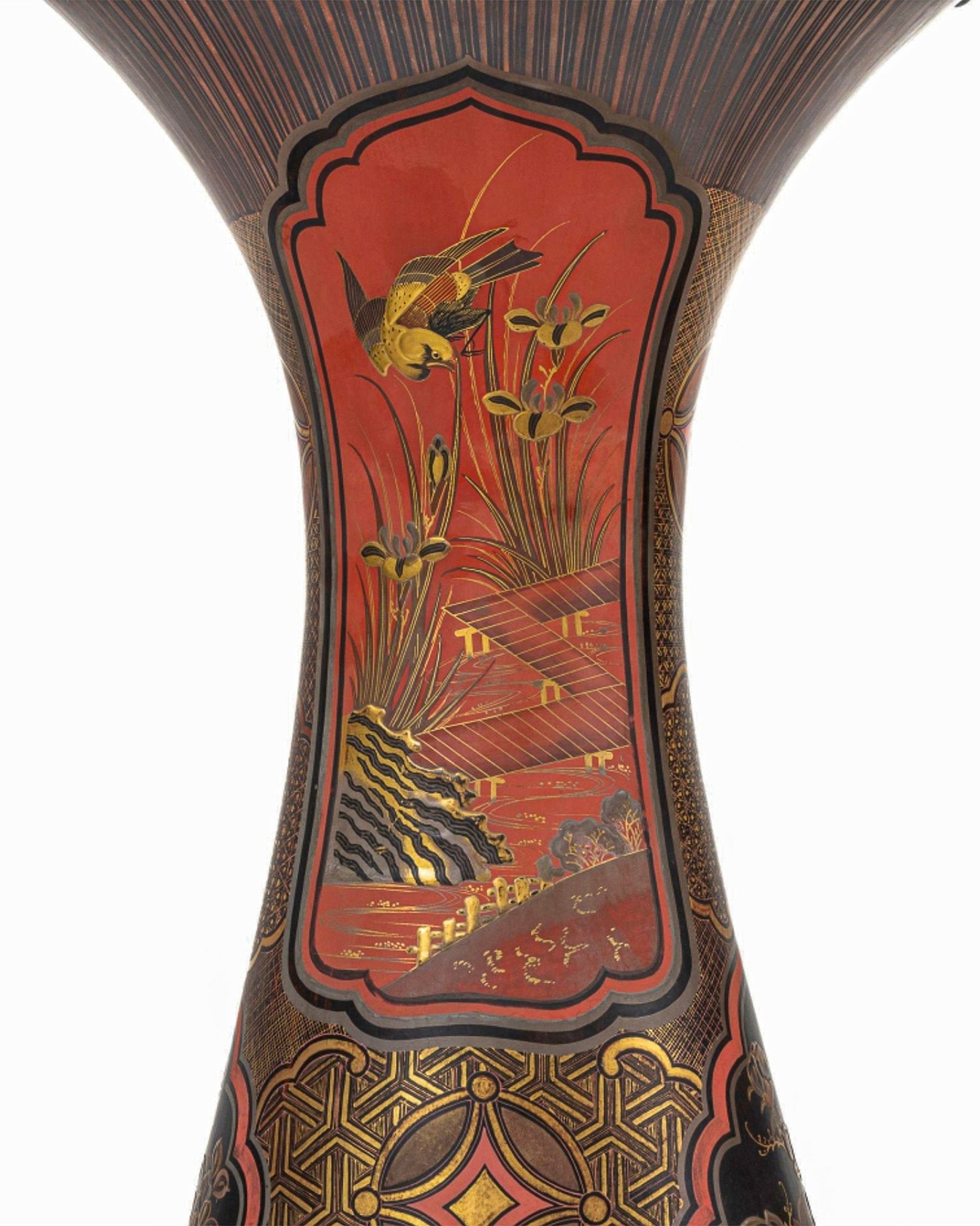 Adorned with intricate makie techniques, the vases feature reserved panels framed by geometric motifs in vibrant gold and crimson, each panel revealing delicate depictions of birds perched among stylized branches and blossoms. The meticulous lacquer work, layered with natural urushi resin, highlights the graceful designs in gilt against the deep black backdrop.