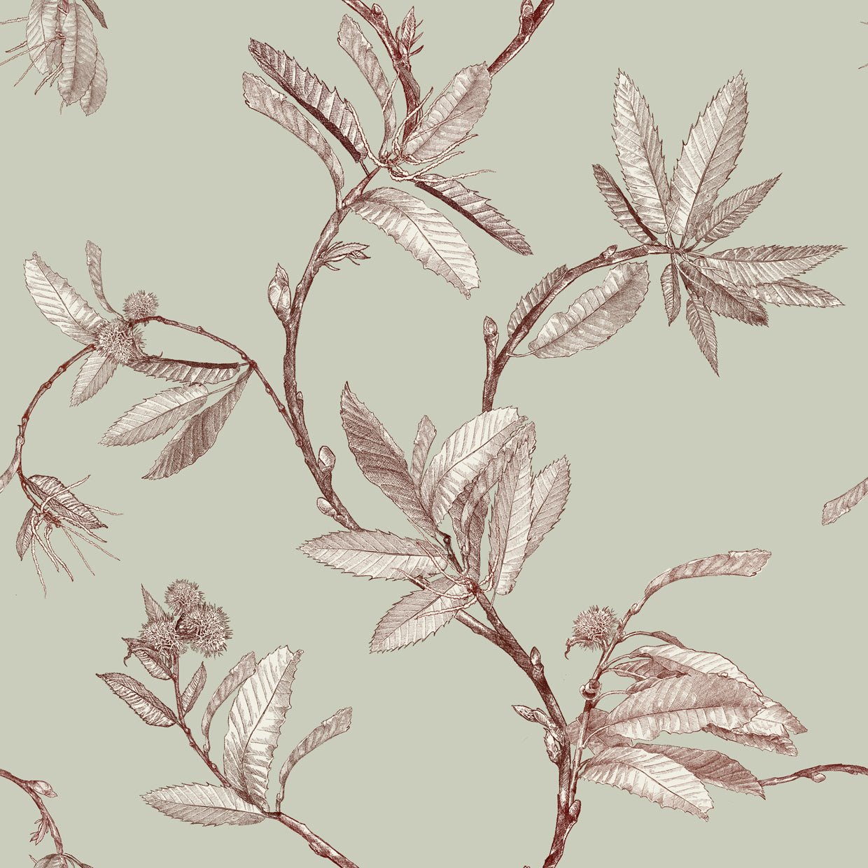 Hand-illustrated with exquisite detail, Catkin Charm features delicate branches adorned with serrated Sweet Chestnut leaves, budding catkins, and spiky husk remnants. Rendered in monochromatic silvered and sepia hues on a soft sage green background, this repeating pattern evokes the tranquil transition of autumn foliage. This soft botanical print making is an ideal choice for bedrooms, living rooms, or hallways seeking a touch of elegance.